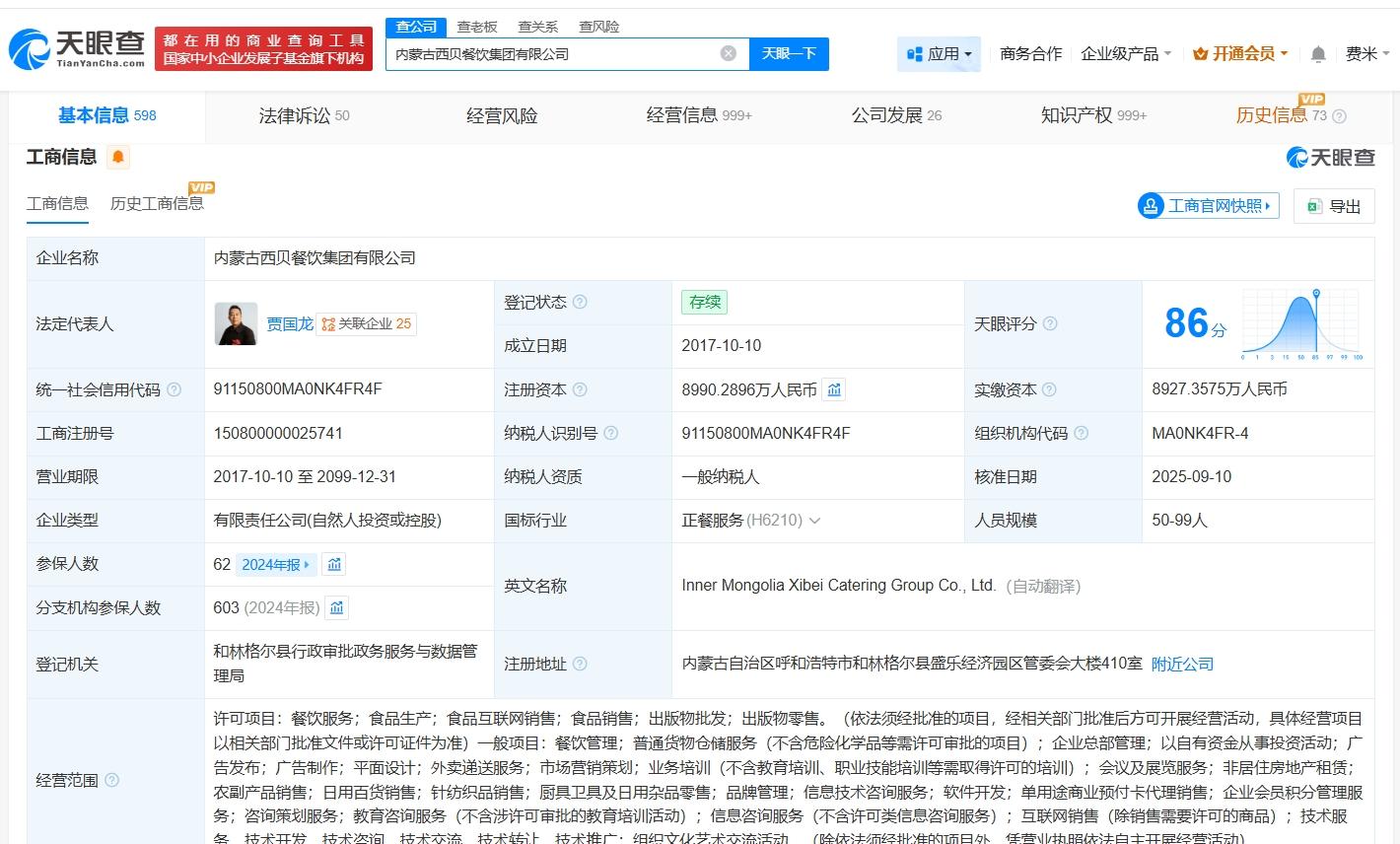 西贝关联公司内蒙古西贝餐饮集团有限公司成立于2017年10月,法定代表人为贾国龙,注册资本约8990万人民币,经营范围含餐饮服务、食品生产、食品互联网销售等,由北京西贝企业管理有限公司、贾国龙、呼和浩特市人生喜悦企业管理中心(有限合伙)等共同持股。值得一提的是,近日,该公司旗下呼和浩特市俊义企业管理有限公司新增一则简易注销公告,公告期为1月13日至2月2日。此外,自去年9月罗永浩在社交平台吐槽西贝菜品“几乎全是预制菜”后,该公司旗下贵州西贝万家餐饮管理有限公司、广州西贝餐饮有限公司、惠州莜面村高峰餐饮管理有限公司等十余家公司发生高管变更。