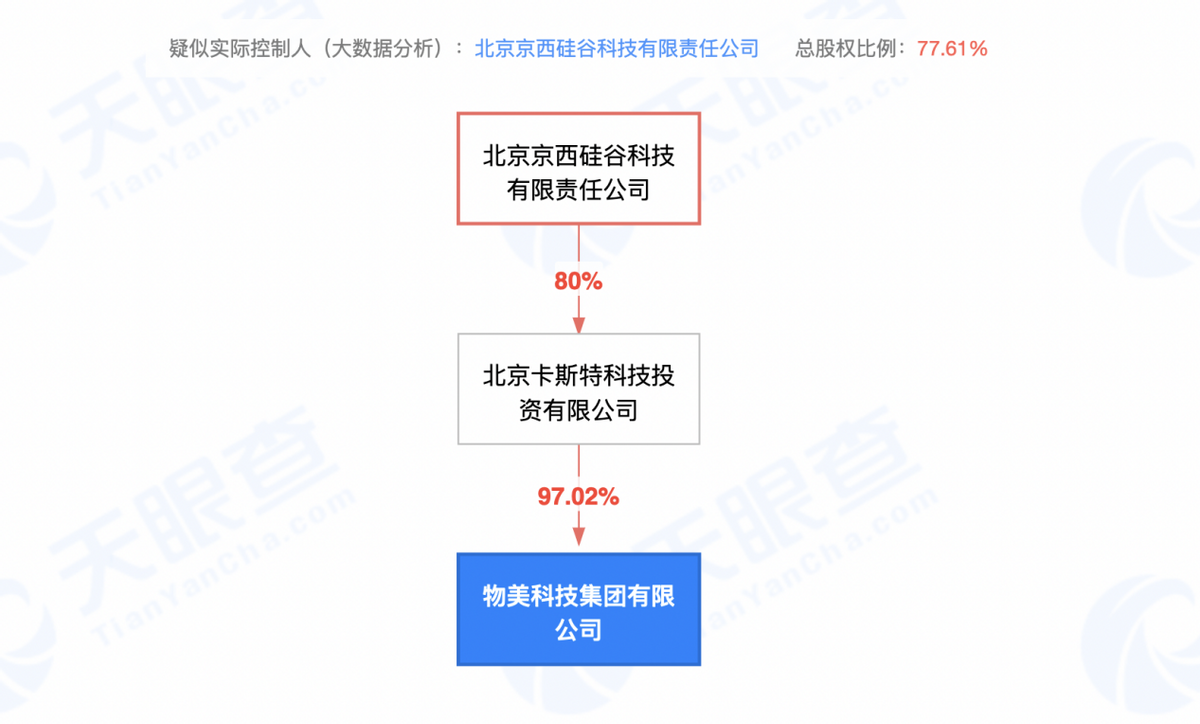 根据天眼查App信息显示,物美科技实际控制人为北京京西硅谷科技有限责任公司,该公司法人为物美创始人张文中。