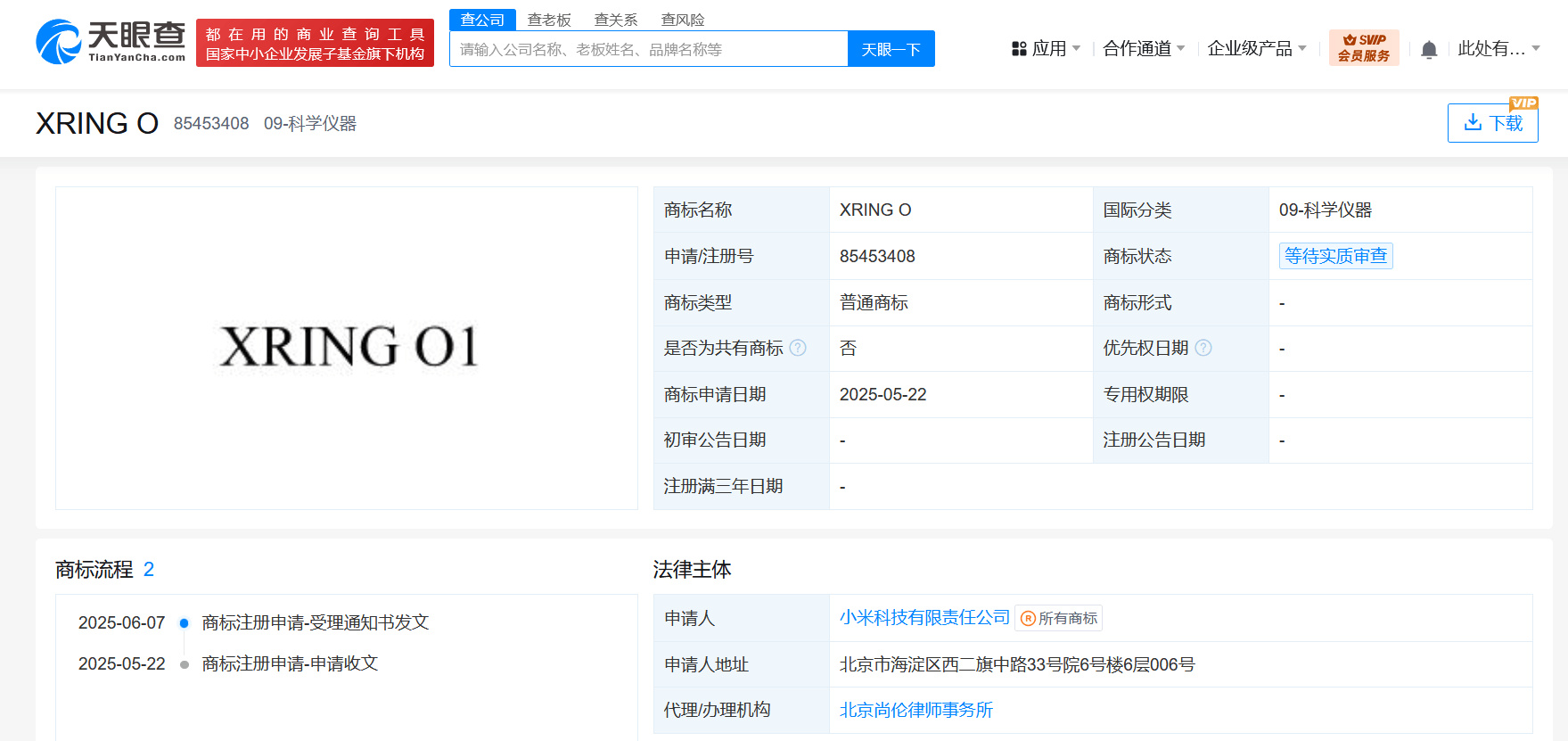 天眼查财产线索信息显示,近日,小米科技有限责任公司申请注册“XRING O1”“XRING T”“小米天际屏”等多枚商标,国际分类为科学仪器、运输工具等,当前商标状态均为等待实质审查。