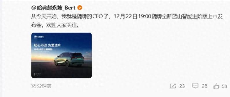 今早,哈弗CEO赵永坡在社交平台上官宣“从今天开始,我就是魏牌的CEO了”,语气随意得像在说“今天中午吃驴火”。