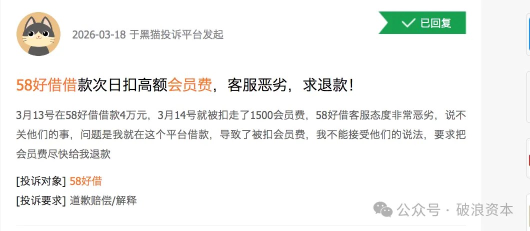 破浪资本梳理发现,此类强制扣费并非个例。2026年2月28日,另有网友投诉称,其在不知情、未授权的情况下,被上海闪态网络技术有限公司通过易宝支付,从银行卡扣款495元,扣款渠道明确标注为58好借,而其从未主动开通任何会员、担保服务。更令人无奈的是,当消费者联系平台客服沟通退款时,均遭遇推诿,部分用户还收到“会员服务已生效,因使用附赠权益无法取消”的短信回复。