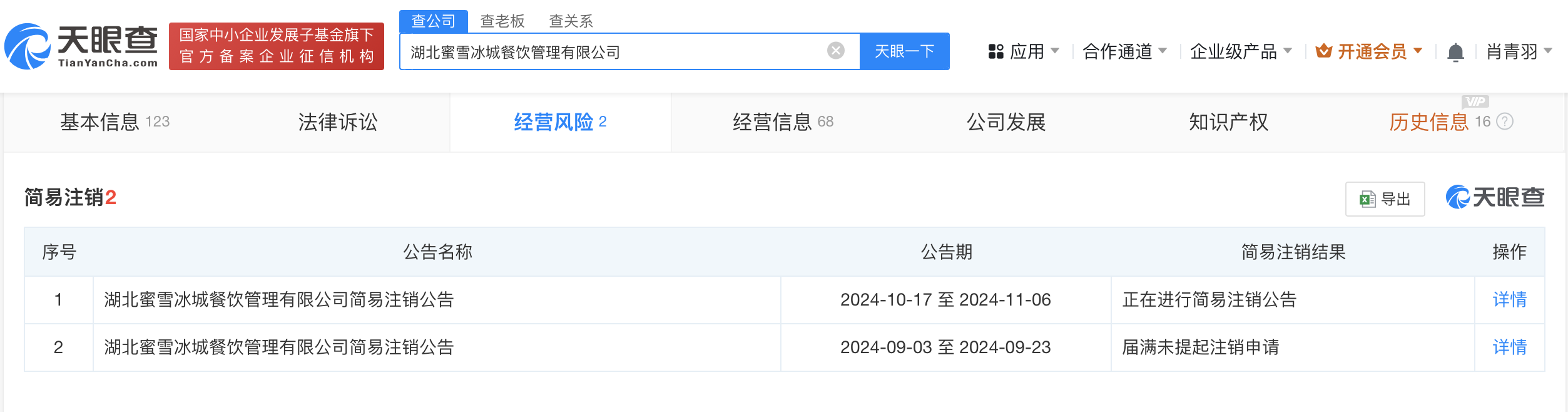 天眼查经营风险信息显示,近日,湖北蜜雪冰城餐饮管理有限公司新增一则简易注销公告,公告期自10月17日至11月6日。
