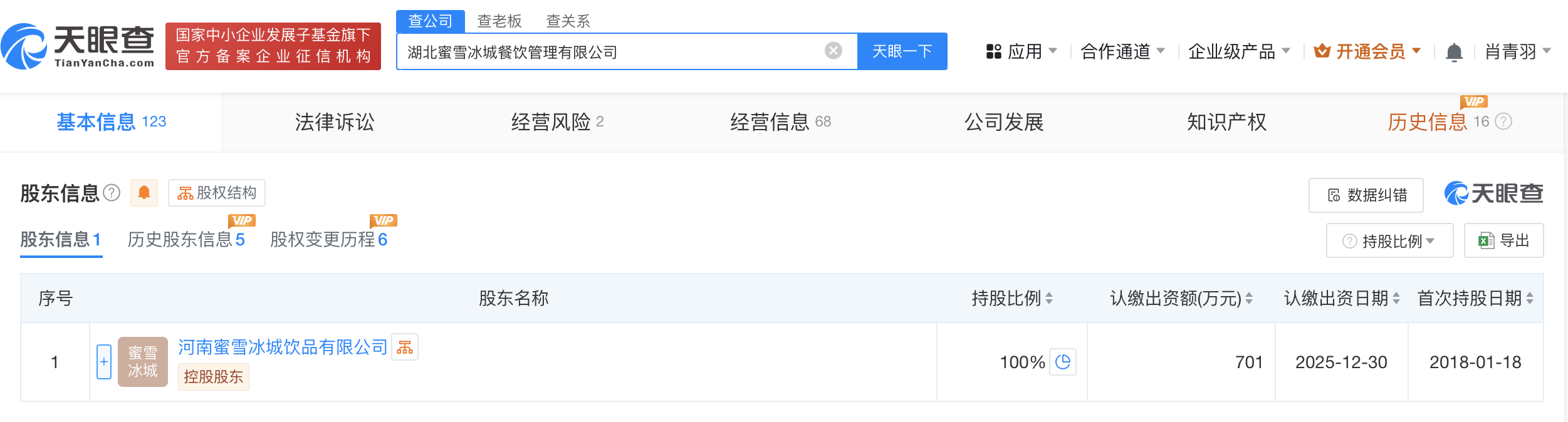 该公司成立于2017年12月,法定代表人为付俊冲,注册资本701万人民币,经营范围含餐饮服务、餐饮管理、企业管理咨询、企业营销策划等,由河南蜜雪冰城饮品有限公司全资持股。