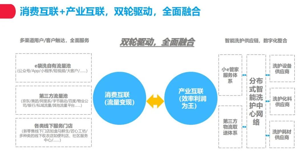 谈起e袋洗的未来布局,张荣耀认为洗衣行业有两种属性,服务属性和加工属性。服务属性侧重在消费互联,直接面对用户。而加工属性侧重在产业互联,重点就是智能洗护中心为核心的智能洗护供应链。