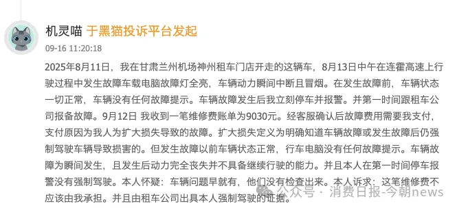 就如兰州一位消费者,2025年8月租赁的车辆在高速上突然电脑故障灯全亮、动力中断并冒烟,故障前无任何提示,其第一时间停车报警并报备,却被认定为“人为扩损”,索要9030元维修费。