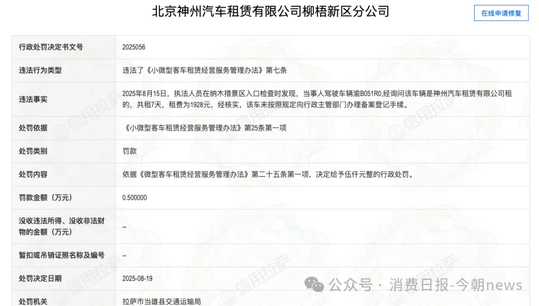 从合规性看,神州租车多项运营行为正触碰监管红线。行政层面,公司多次因车辆未备案、使用非营运车辆从事租赁业务被罚,2025年拉萨分公司分别被处以5000元罚款,2026年南昌分公司更被查实36台运营车辆仅5台备案,违反《小微型客车租赁经营服务管理办法》中车辆须登记为“租赁”性质并备案的规定。