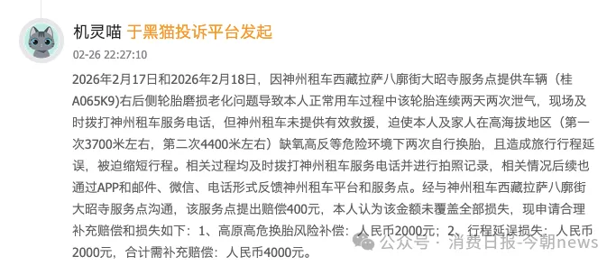 救援与售后流程违规,则让消费者在遭遇故障时陷入“求助无门”的困境,进一步放大维权难度。神州租车承诺的救援服务屡屡响应迟缓,侯先生在高速被困等待近3小时无救援,只能自行付费拖车;西藏一位消费者租赁的车辆因轮胎老化连续两天泄气,拨打客服电话却未获有效救援,被迫在3700米至4400米的高海拔地区自行换胎,不仅面临缺氧高反风险,还导致行程严重延误。