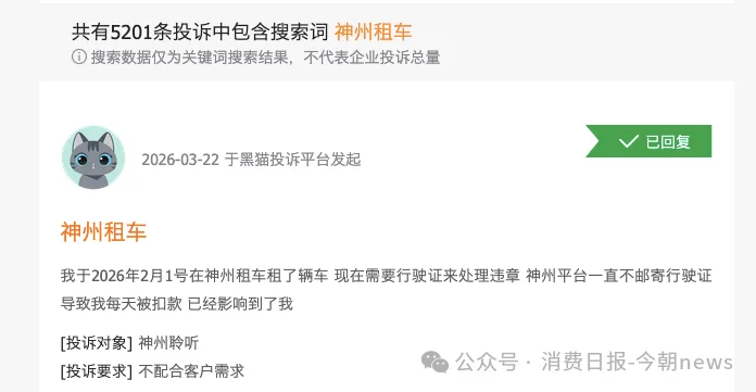 这并非个例,截至4月初,黑猫平台上关于神州租车的投诉已经超过5000条。黑猫投诉平台案例显示,神州租车已形成一套成熟的争议套路,核心皆是通过责任转嫁、证据隐匿、费用虚高、流程违规,将经营风险与损失悉数转嫁给消费者。