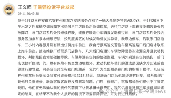 1月23日门店称水箱受损,1月28日平台直接生成13213.36元维修账单,将发动机损坏定性为“扩损”,要求侯先生全额承担,且始终拒绝提供正规鉴定报告、维修明细与保险拒赔说明,侯先生多次沟通无效,直至2月向媒体曝光,神州租车仅回应“正在推进核实”。