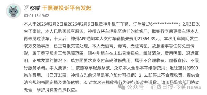 有消费者2026年2月租车发生事故,已购买尊享服务,且无任何免责情形,却被要求支付21564.39元车辆损失费,平台未出示任何定损、维修依据,仅靠APP推送账单强行扣费。即便消费者购买了“尊享服务”“全程无忧”等付费保障,也常沦为摆设。
