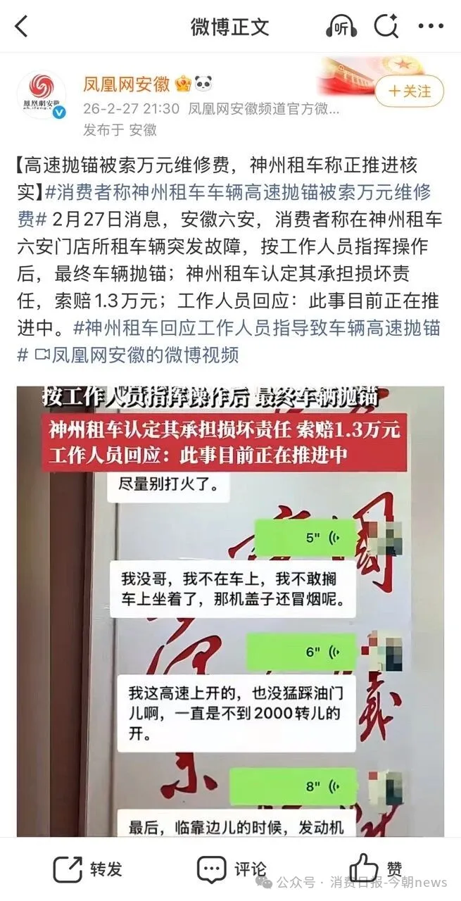 2026年初,安徽消费者侯先生的一次神州租车体验,最后成为了一场持续多月的维权拉锯战。因租赁车辆自身故障引发发动机损坏,他不仅遭遇高速被困3小时求助无门的窘境,还被平台单方面认定“人为扩损”,索要超1.3万元维修费,且一直无法获取正规鉴定报告与维修明细。