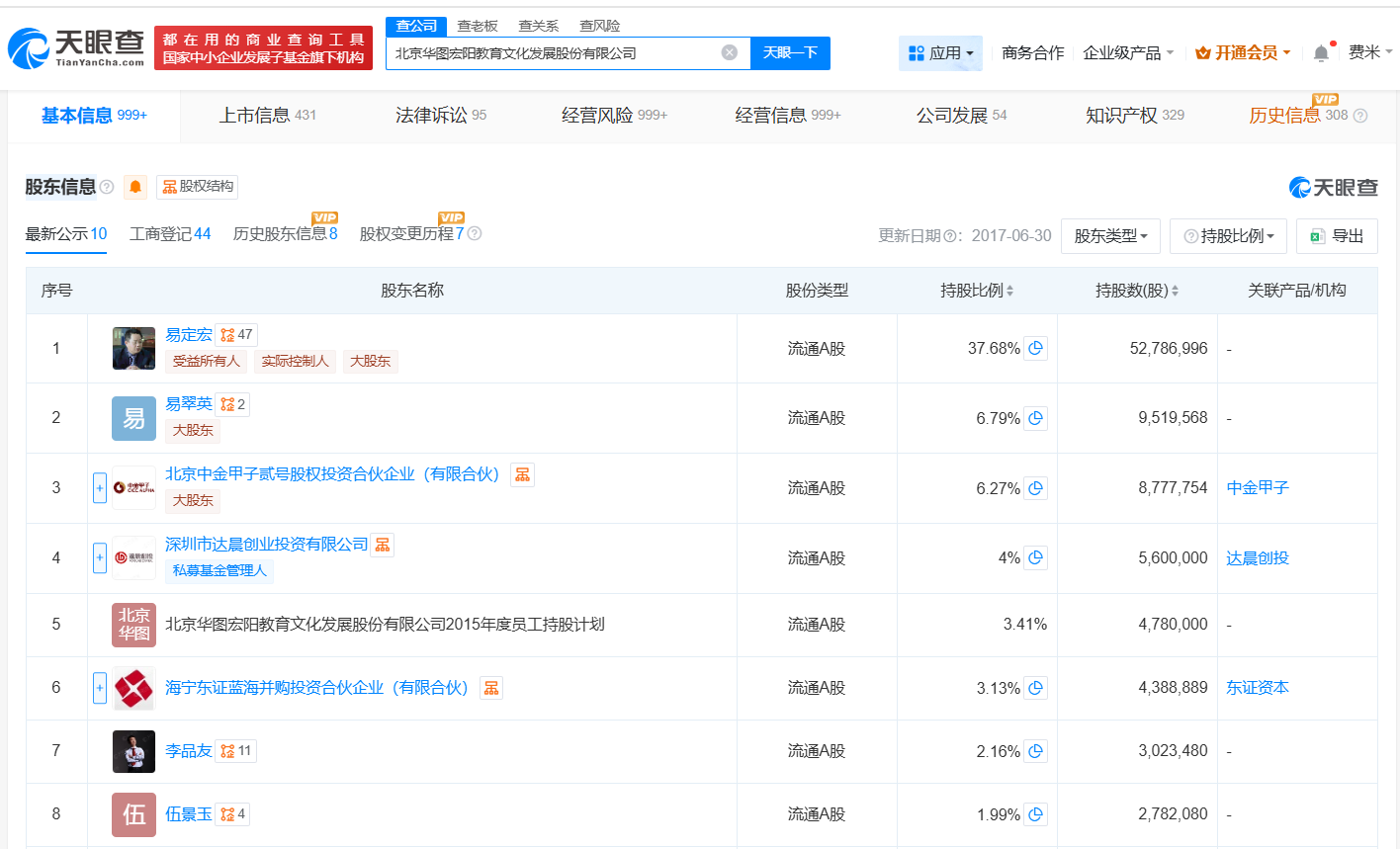 天眼查App显示,近日,北京华图宏阳教育文化发展股份有限公司发生工商变更,易定宏卸任法定代表人、董事长,由易定国接任。
