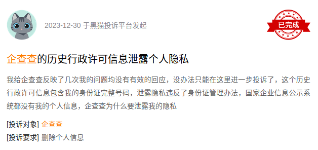 然而,企查查并不是官方网站,但在他上面可以查询到官方网站已经删掉(修复)过的处罚记录,这样从合规性上来说是不是有些不合适?类似的消息我们在第三方投诉平台黑猫投诉上就有看到,有网友说自己企业没欠税信息,企查查却公示了,并且在后续评论道:“税务局官网都没有欠税信息,企查查app从哪查的欠税?”毫无疑问,事情最终以企查查删除先关信息。
