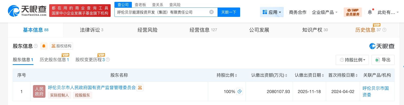 天眼查工商信息显示,近日,呼伦贝尔能源投资开发(集团)有限责任公司发生工商变更,呼伦贝尔城市建设投资(集团)有限责任公司退出股东行列,同时,注册资本由1亿人民币增至约208亿人民币,增幅约20701%。