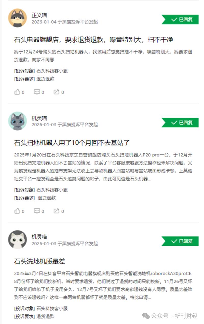截至2016年1月5日,在黑猫投诉等平台上,有2140起针对石头科技的投诉,而完成率只有76%。关于产品清洁效果不佳、噪音大、有异味、无法回站等问题的投诉屡见不鲜。尤其是在其试图打造“高端品牌”的当下,产品定价动辄四五千元,但交付给用户的体验却未能完全匹配这一身价。