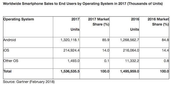 据高德纳(Gartner)公司的分析数据显示,2017年全球售出的智能手机中,99.9%都是Android或iOS系统,这两个系统在市场竞争中大获全胜。从2017年的比例看出, Android的使用程度比iOS高,约为86比14,其他系统的使用率还不如0.1%。另外,2017年全球智能机售出超过15亿部,但黑莓操作系统(BlackBerry OS)、Windows Mobile以及所有其他平台的手机总数才150万部。
