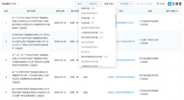 可见,“机动车交通事故责任纠纷”是公司数量最多的诉讼类型。作为国内主要的车险提供商,大量的车险业务必然伴随相应的理赔和纠纷。这类诉讼虽然单案标的不一定巨大,但总量庞大,会持续消耗公司的法务和人力资源。