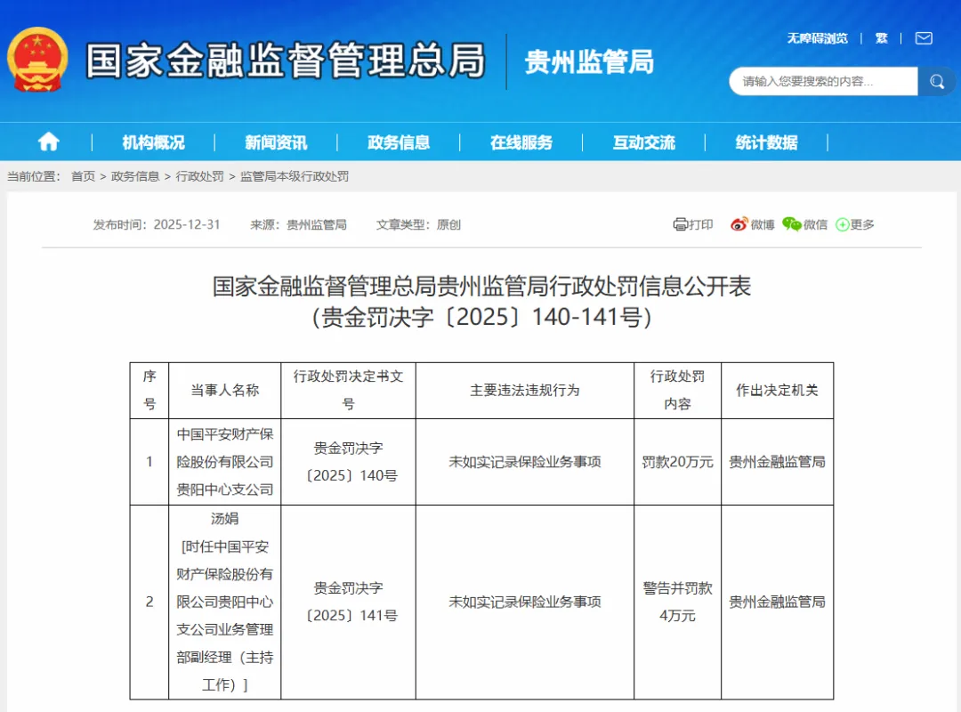 2025年12月31日,贵州监管局披露罚单,平安财险贵阳中心支公司因“未如实记录保险业务事项”,被处以20万元罚款;时任该公司业务管理部副经理汤娟因同样违规行为,同步被警告并罚款4万元。