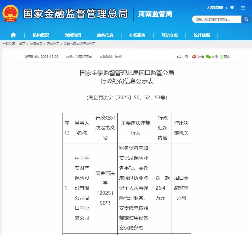 2025年12月29日,河南周口监管分局更是指出平安财险周口中心支公司存在多项违规:财务资料未如实记录保险业务事项、委托未通过执业登记个人从事保险代理业务、安责险未按照规定使用经备案保险条款,最终被处以26.4万元罚款。