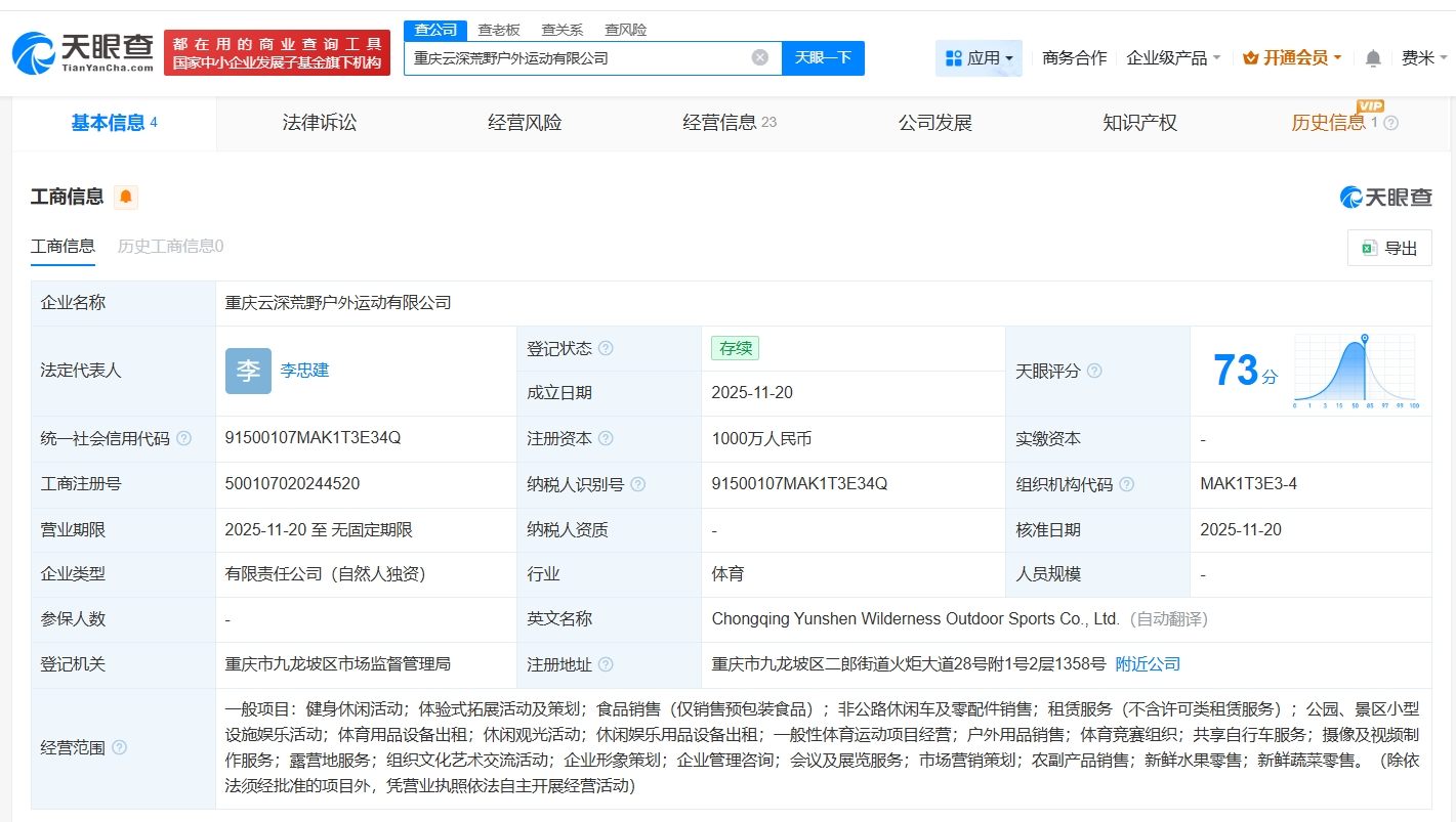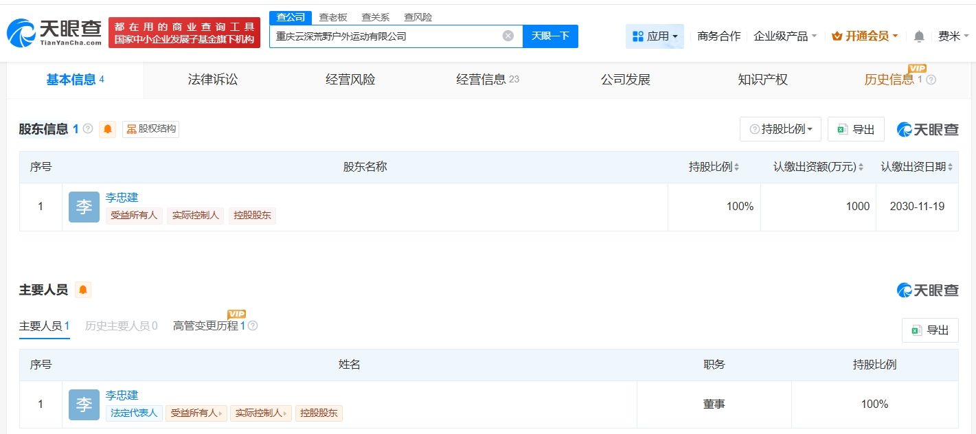 天眼查App显示,涉事公司重庆云深荒野户外运动有限公司成立于今年11月,法定代表人为李忠建,注册资本1000万人民币,经营范围包括健身休闲活动、体验式拓展活动及策划、食品销售等,由李忠建全资持股。