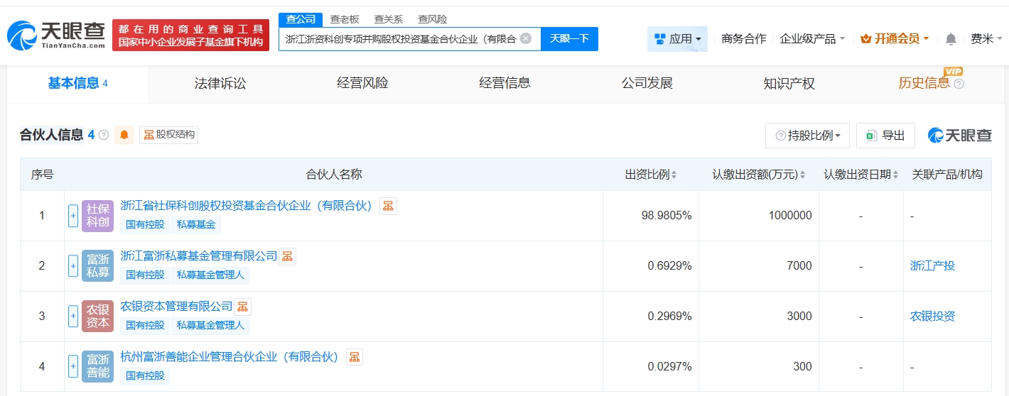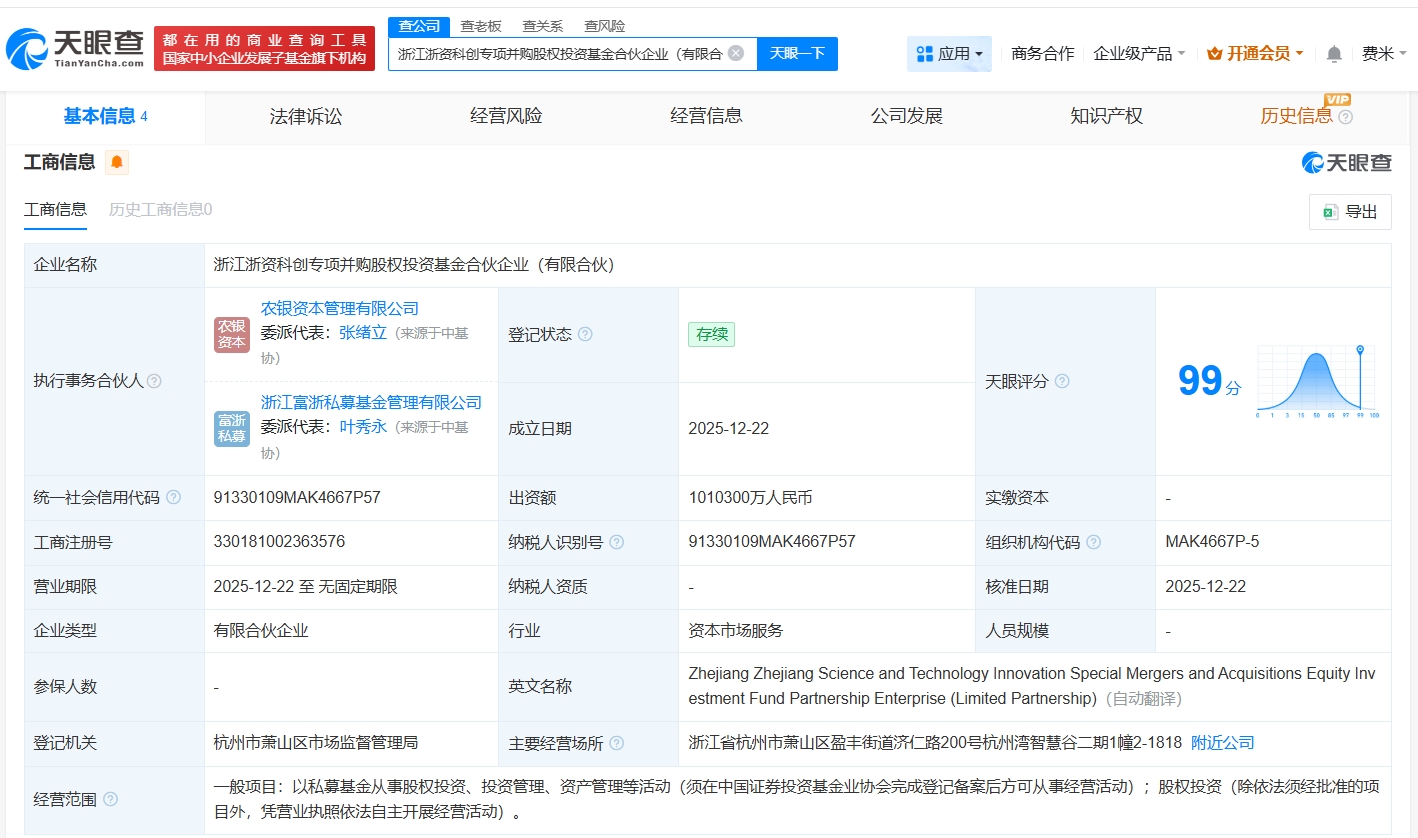 天眼查App显示,近日,浙江浙资科创专项并购股权投资基金合伙企业(有限合伙)成立,执行事务合伙人为农银资本管理有限公司、浙江富浙私募基金管理有限公司,出资额101.03亿人民币,经营范围为以私募基金从事股权投资、投资管理、资产管理等活动,股权投资,由浙江省社保科创股权投资基金合伙企业(有限合伙)、浙江富浙私募基金管理有限公司、农银资本管理有限公司、杭州富浙善能企业管理合伙企业(有限合伙)共同出资。
