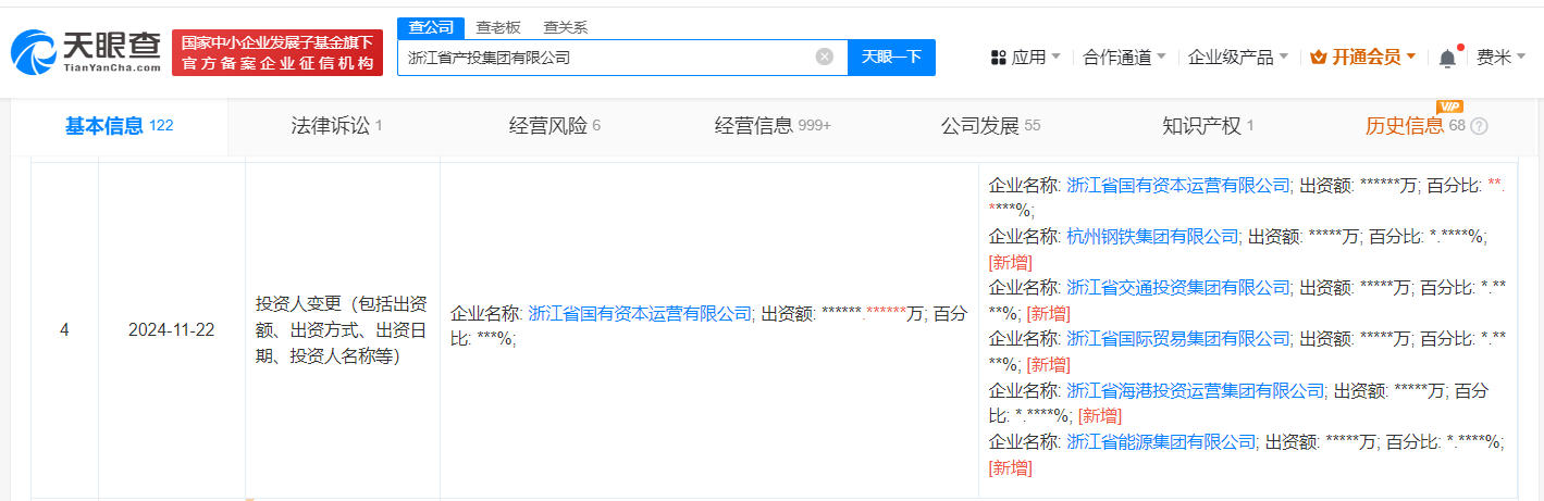 天眼查App显示,近日,浙江省产投集团有限公司发生工商变更,新增杭州钢铁集团有限公司、浙江省交通投资集团有限公司、浙江省国际贸易集团有限公司等为股东,注册资本由约31.1亿人民币增至59亿人民币,增幅约90%,同时多位高管发生变更。