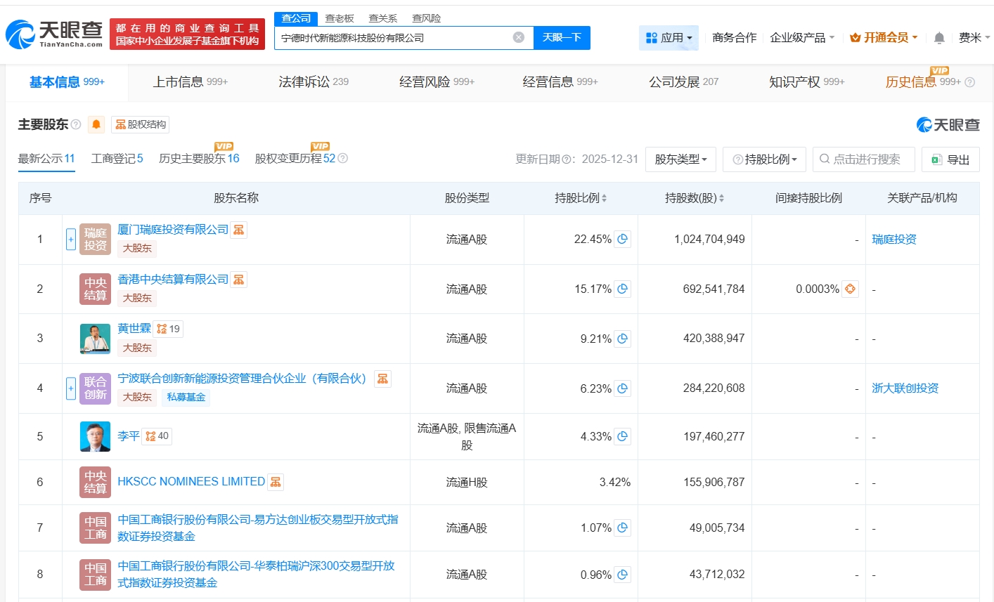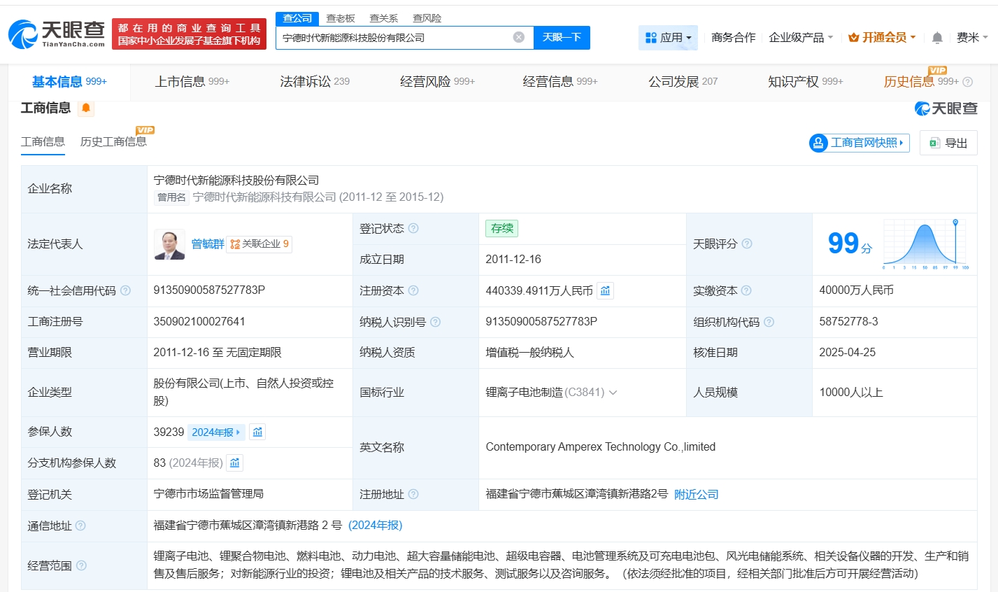 天眼查工商信息显示,宁德时代新能源科技股份有限公司成立于2011年12月,法定代表人为曾毓群,注册资本约44亿人民币,经营范围包括对新能源行业的投资,锂电池及相关产品的技术服务、测试服务以及咨询服务等。股东信息显示,该公司由厦门瑞庭投资有限公司、香港中央结算有限公司、黄世霖等共同持股。控制企业信息显示,该公司控制百余家企业,今年以来,该公司成立了泉州时代新能源科技有限公司、苏州时代新能科技有限公司等十余家新公司。