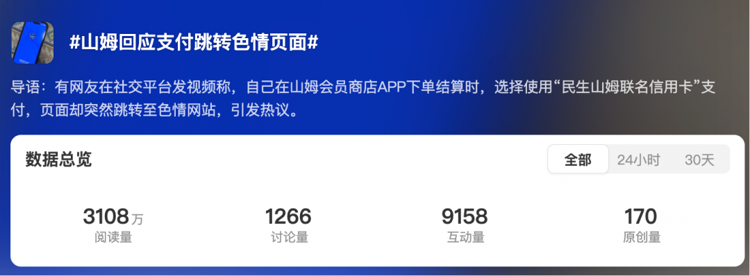 近日,有网友在社交平台发视频称,自己在山姆会员商店APP下单结算时,选择使用“民生山姆联名信用卡”支付,页面却突然跳转至色情网站,引发热议。