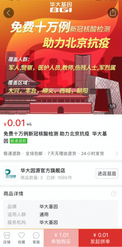 拼多多大健康负责人表示,“针对目前北京地区的疫情,我们发现相关人群对于核酸检测有很密集的需求。所以我们决定联合华大基因,为这批人群提供免费的核酸检测服务。”