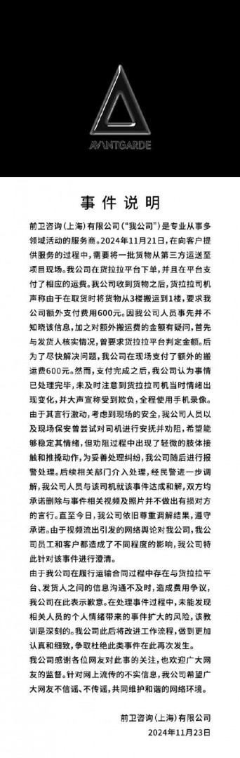 保时捷方面称,11月21日,合作方项目组(前卫咨询上海有限公司)与货运平台工作人员发生了纠纷事件,保时捷已第一时间向涉事人员了解详情,涉事人员是合作方的正式员工,合作方确认其员工与货运平台员工的纠纷已在相关部门的介入下进一步处理,双方已于当日达成和解。