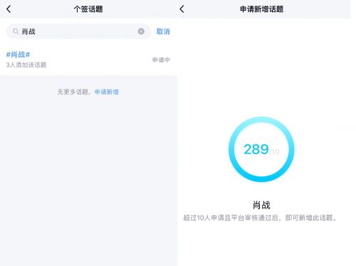 以#肖战#为例,小编在今日下午1:55分编辑个性签名时,还没有这个话题,10分钟之后,已经有3人添加了该话题,289人申请新增该话题,待平台审核通过,就可以发布带有该话题的个性签名了。