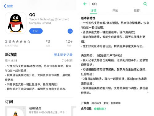 QQ在iOS端(左)和安卓端(右)的更新简介