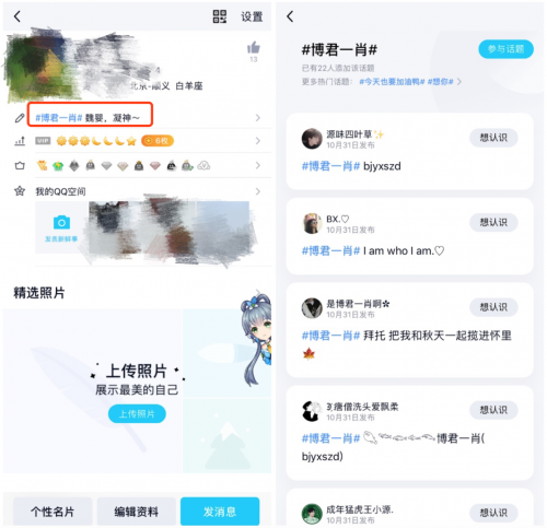 最后,点击好友或者你发布个性签名中的话题,进入话题聚合页面,就可以发现设置同样话题的好友或非好友。从有趣的分享中,我们就可以认识更多的朋友,还可以一起为爱豆打call。