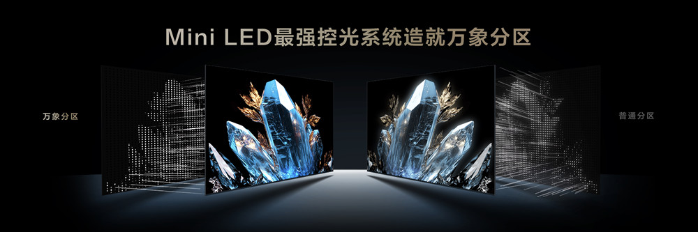 作为行业最早布局Mini LED赛道的电视企业,TCL基于多年来的深耕和积累,对Mini LED底层技术进行升级,实现从背光到成像的完整链路系统级的技术突破,包括发光芯片、透镜技术、OD设计、控光算法和屏幕等。基于此,TCL研发了当下Mini LED最强控光系统——万象光晕控制技术,采用这一技术的分区便是万象分区,控光效果是普通分区数倍,为消费者带来了前所未有的Mini LED画质体验。