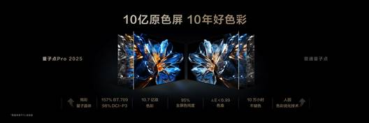 在全新量子点材料和色彩调校的共同作用下,搭载量子点Pro 2025的TCL电视具备行业超高的色域值,能够显示10.7亿级色彩,电视全屏色纯度提升95%,色准ΔE<0.99,色彩表现精准。更重要的是,由于量子点的无机材料特性,其稳定的使用寿命达到10万小时不褪色,真正实现10亿原色屏,10年好色彩。
