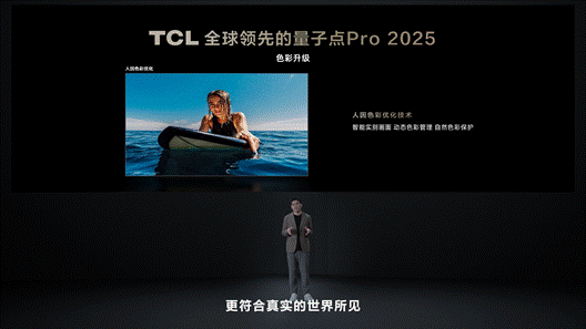 在材料方面,量子点Pro 2025进行了全面升级。由四元量子晶体升级为绚彩量子晶体,使用复合纳米金刚结构,并采用多层共挤技术和高精密混合技术制成量子点层,大幅提升发光效率。同时,TCL采用人因色彩优化技术,通过智能识别画面色彩,根据画面不同颜色采用动态色彩管理,进行多维渲染,让量子点的色彩显示更符合人眼对世界的感知。