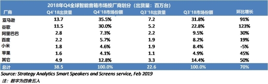 近日,美国研究公司Strategy Analytics最新发布了《2018年第四季度全球智能音箱市场报告》。报告显示,2018年Q4,全球智能音箱出货量增长了95%,达到3850万台,超过了2017全年的总出货量,并使2018年的总出货量达到8620万台。其中,亚马逊、谷歌智能音箱全球出货量与市场份额继续全球领先,国内企业方面,阿里巴巴列全球第三位,百度智能音箱出货量赶超小米,跻身全球前四。