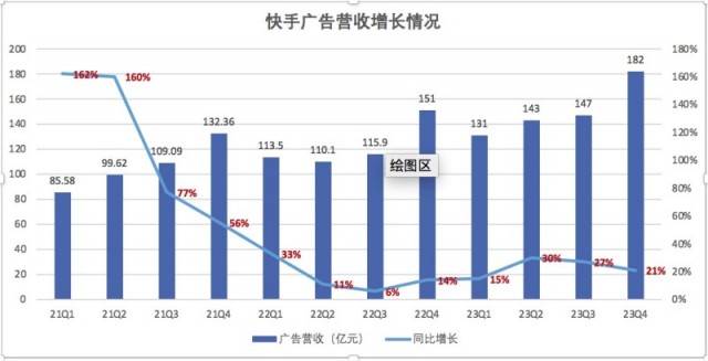 总的来看,快手第四季度广告收入同比增长20.6%至182亿元,占据总营收半壁江山,达55.9%。2023年全年,快手广告营收603亿元,同比增长23%,占总营收的比重为53.1%。