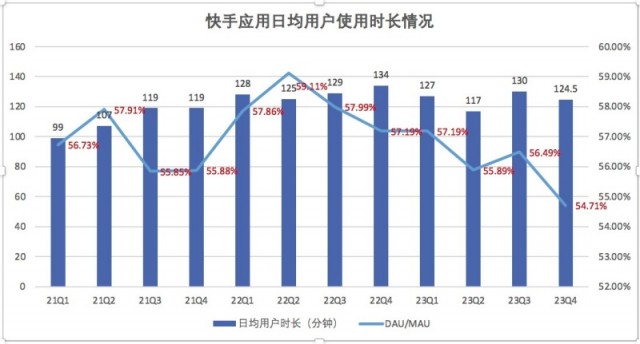 2023年第四季度,快手应用的平均日活跃用户和平均月活跃用户分别达到3.825亿和7.004亿,同比分别增长4.5%和9.4%。于同一期间,快手应用的每位日活跃用户日均使用时长达到124.5分钟,上个季度为129.9分钟,从DAU/MAU的结果来看,用户粘性有所减弱。