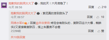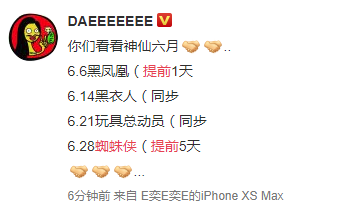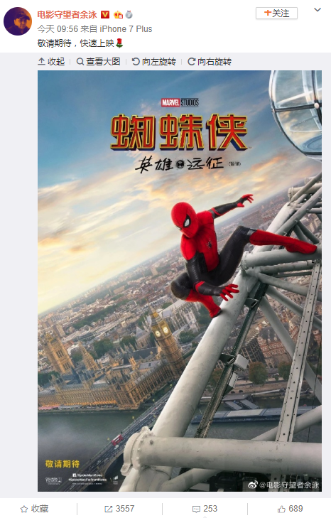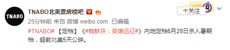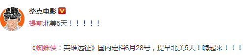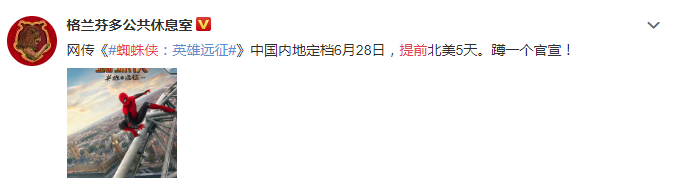 据小道消息称《蜘蛛侠:英雄远征》内地有望提前到6月28日上映,而北美是7月2日上映,提前了5天!尽管目前还没有官方消息发布,但是如此多的微博大V发布相关消息,自然不会是空穴来风,而之前官方发布的中文宣传片让大家以为中国内地的上映时间会和北美一样是在7月2日。附上一些微博大V的相关消息截图: