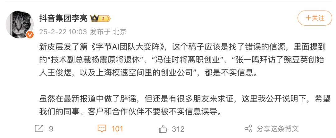 【TechWeb】2月22日消息,针对近期有媒体报道的《字节AI团队大变阵》,抖音集团副总裁李亮今日发文回应称,这个稿子应该是找了错误的信源,里面提到的“技术副总裁杨震原将退休”“冯佳时将离职创业”“张一鸣拜访了豌豆荚创始人王俊煜,以及上海模速空间里的创业公司”,都是不实信息。