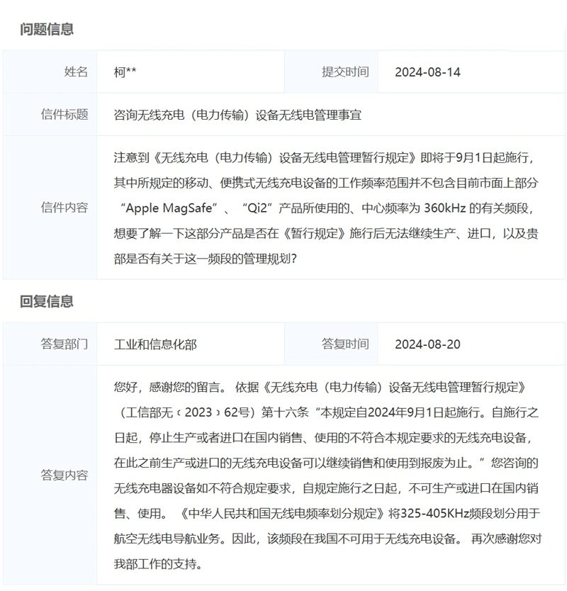 而 MagSafe 和 Qi2 协议使用的频率为 360kHz,并不在规定工作频率范围内。据IT之家此前报道,工信部回复网友留言时表示,325-405KHz 频段划分用于航空无线电导航业务,该频段在我国不可用于无线充电设备。如不符合规定要求,自规定施行之日起,不可生产或进口在国内销售、使用。
