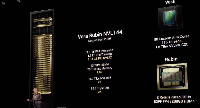将于2026年推出的下一代AI芯片Vera Rubin,Vera Rubin整体性能更是GB300的3.3倍。