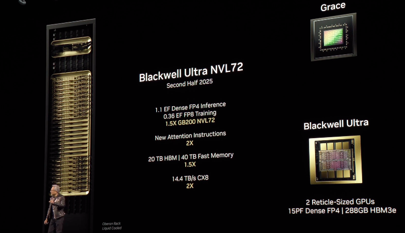 据黄仁勋介绍,新一代芯片Blackwell Ultra(GB300)将在今年的下半年出货,性能方面,和去年发布的GB200相比,推理性能是其1.5倍。