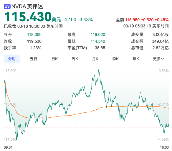 当天美股收盘,英伟达股价仍下跌3.4%,报115.43美元,总市值缩水至2.82万亿美元。