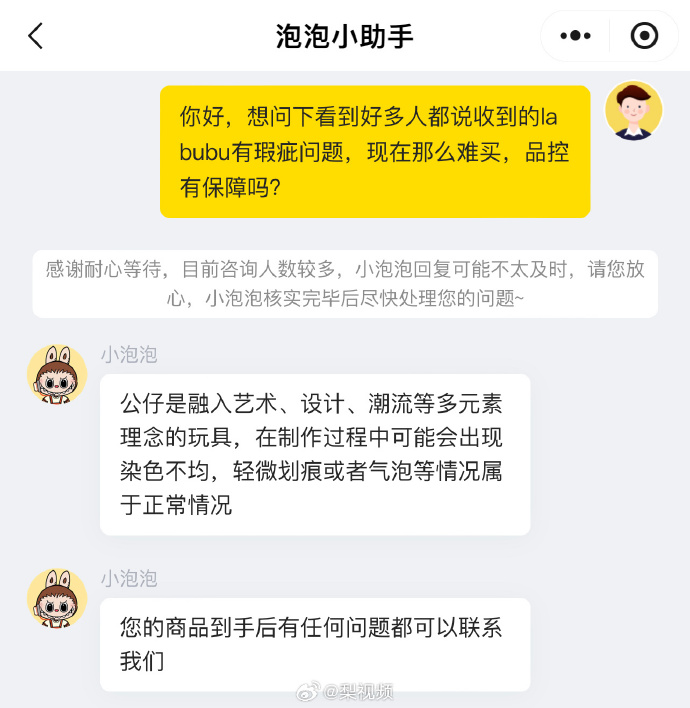 对此,泡泡玛特客服表示,公仔是融入艺术、设计、潮流等多元素理念的玩具,在制作过程中可能会出现染色不均,轻微划痕或者气泡等情况属于正常情况,商品到手后有任何问题都可以联系客服。