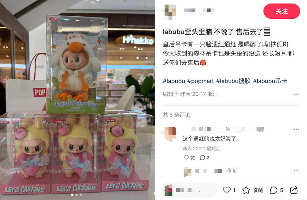 在小红书等平台上,也有网友反映,“收到的森林吊卡也是头歪的没边,还长短耳,都送你们去售后。”