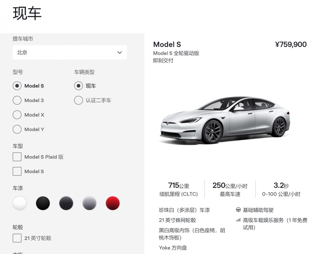 如图所示,特斯拉官网显示,北京地区一辆Model S全轮驱动版“即刻交付”的价格为75.99万元。