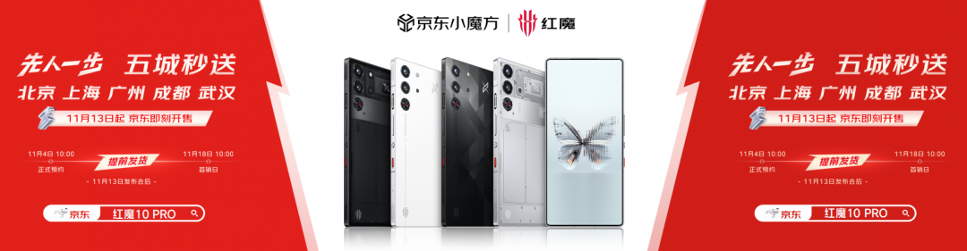 目前红魔携手京东开启全球独家先人一步新品尝鲜购,不仅能享受价值599元的红魔careplus权益包及白条12期免息,而且次日即可享受新机,北京、广州、上海、武汉、成都五个城市部分地区最快半小时到手。11月18日10:00,红魔10 Pro系列正式开售,感兴趣的朋友可到红魔京东自营旗舰店、红魔官方旗舰店、红魔官网了解购买。