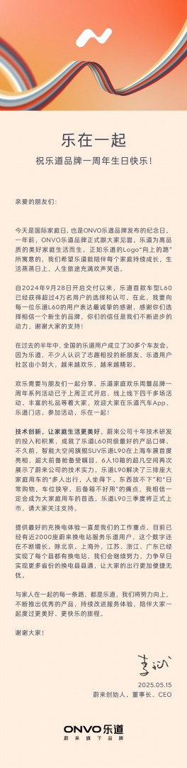 【TechWeb】5月15日消息,蔚来创始人、董事长、CEO李斌今日在乐道品牌成立一周年之际发布长文庆祝,并表示:自2024年9月28日开启交付以来,乐道首款车型L60已经获得超过4万名用户的选择和认可。